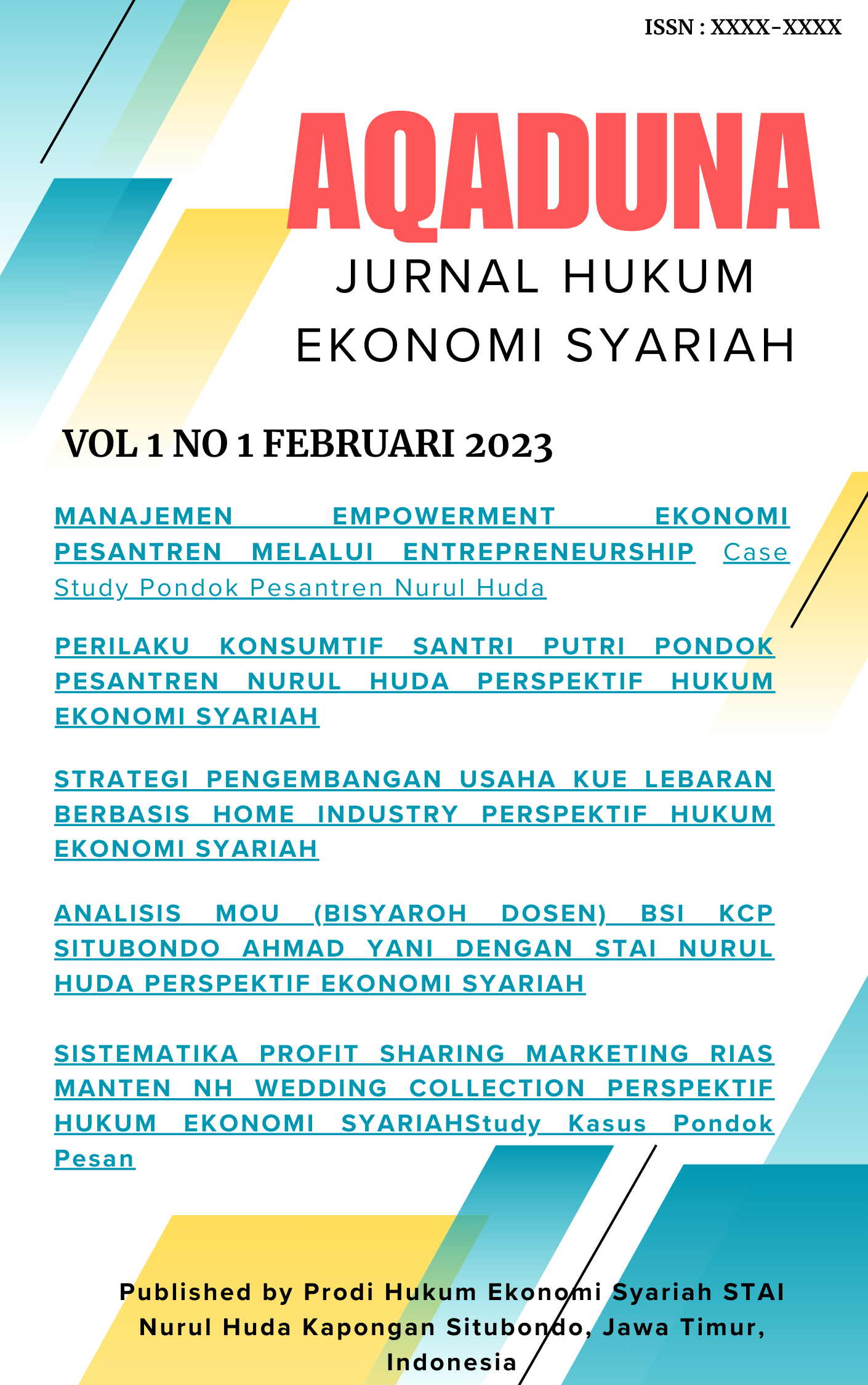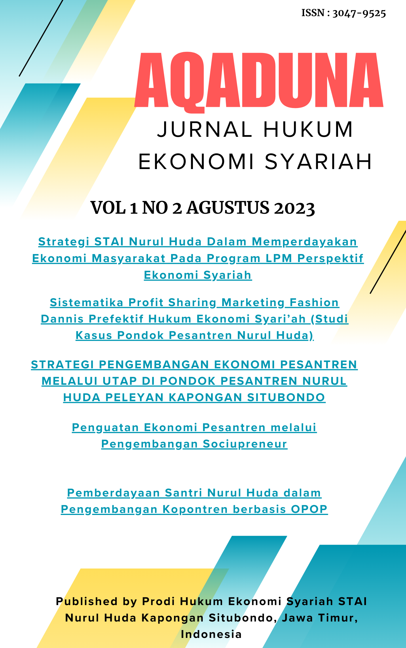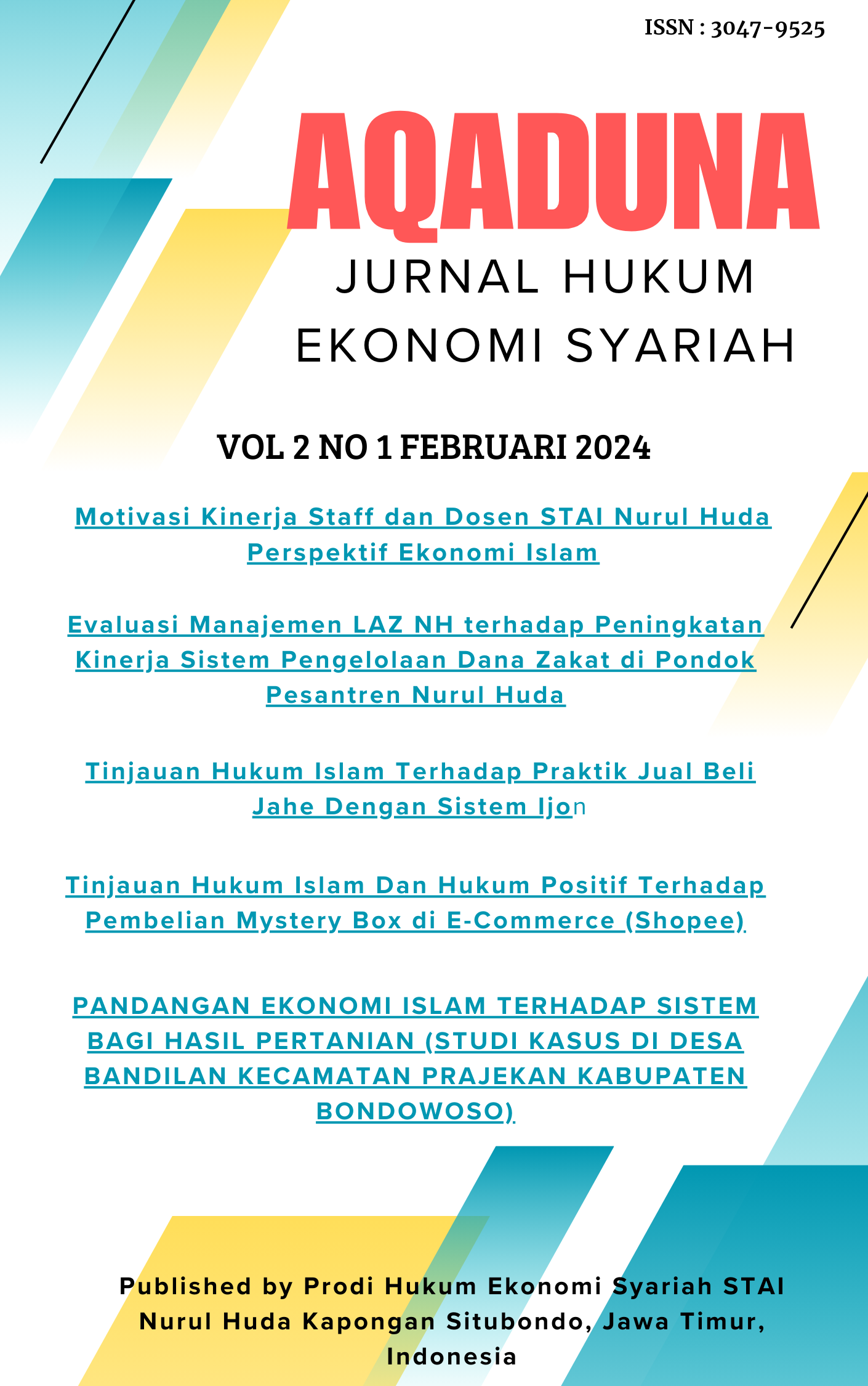 AQaduna : Jurnal Hukum Ekonomi Syariah di terbitkan oleh Prodi Hukum Ekonomi Syariah STAI Nurul Huda. Jln. AL-Habibi No 02 Peleyan Kapongan Situbondo, Jawa Timur, Indonesia.